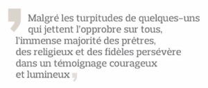 (Valendo à pena; transcrever literalmente: “Malgré les turpitudes de quelques-uns qui jettent l’opprobre sur tous, l’immense majorité des prêtres, des religieux et des fidèles persévere dans un temoinages courageux et lumineux”)