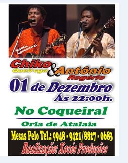 ChiKo Queiroga e Antônio Rogério, amanhã, 01, no Coqueiral