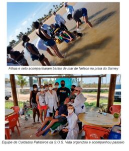 Segurança O passeio foi acompanhado pela geriatra Luana Brandão, que é responsável pelo tratamento de Nelson, e pela equipe de Cuidados Paliativos da S.O.S. Vida, incluindo assistente social e enfermeira. O transporte até a praia do Sarney, em Aracaju, foi realizado na ambulância da empresa de Home Care com o suporte necessário para garantir a segurança dele. “Esses momentos são importantes para pacientes em fase avançada da doença. Eles precisam se sentir bem, ter qualidade de vida. E proporcionar isso é relevante para evolução da doença, para o bem-estar emocional que acaba acarretando no bem-estar físico dele. Faz parte da nossa assistência principalmente quando fala de paciente em Cuidado Paliativos”, explica Luana Brandão. Já o acesso ao mar foi realizado na cadeira anfíbio cedida pelo projeto Estrela do Mar, instalado no restaurante Solarium. A iniciativa fornece aulas de bodyboarding para pessoas com necessidades especiais, além de dispor da cadeira para quem tem dificuldade de locomoção.