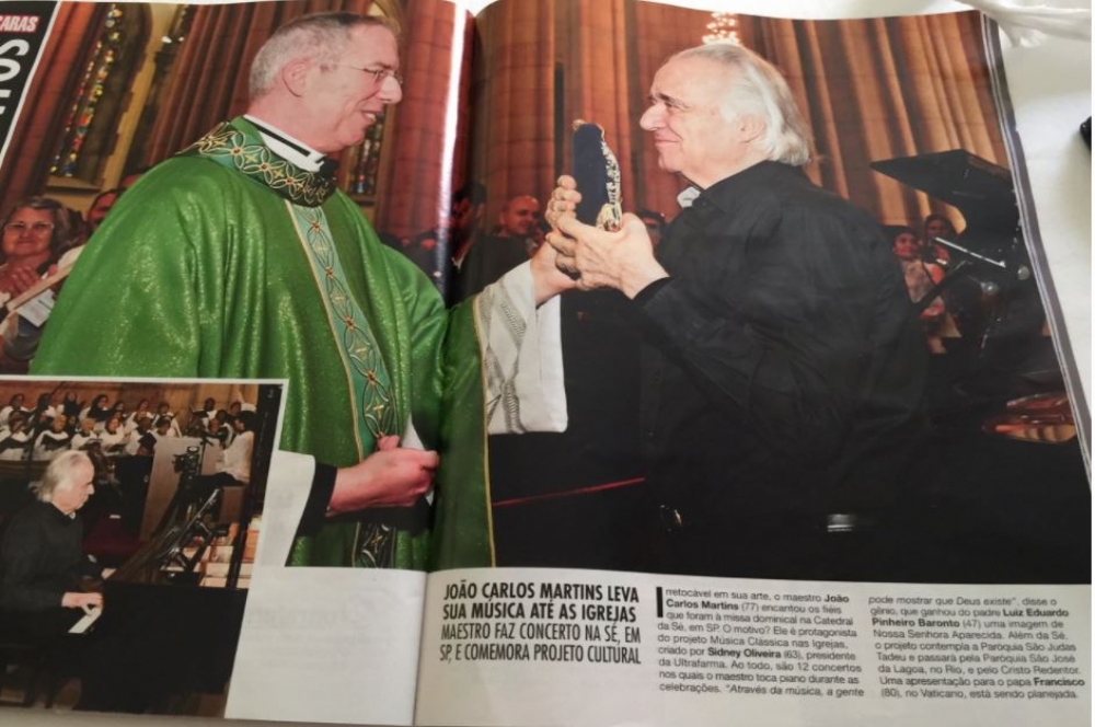 Sergipano entregou imagem de Aparecida a maestro João Carlos Martins Foi destaque na revista Caras (print ao lado) a entrega pelo padre sergipano Luiz Eduardo Pinheiro Baronto (responsável pela Cura da Sé), de uma imagem de Nossa Senhora Aparecida, na apresentação que fez em uma das missas aos domingos na Catedral da Sé (SP). O maestro é protagonista do projeto cultural “Música Clássica nas igrejas” criado por Sidney Oliveira, presidente da Ultrafarma.