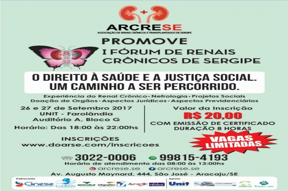 I Fórum de Pacientes Renais de SE A Associação de Renais Crônicos e Transplantados do Estado de Sergipe – ARCRESE, realizará nos dias 26 e 27 de setembro do corrente ano, no auditório da UNIT, o I FÓRUM de Pacientes Renais de Sergipe.O evento tem como objetivo geral trazer ao conhecimento da sociedade a situação da Nefrologia em Sergipe em especial as dificuldades enfrentadas pelos Renais na busca por um tratamento digno.