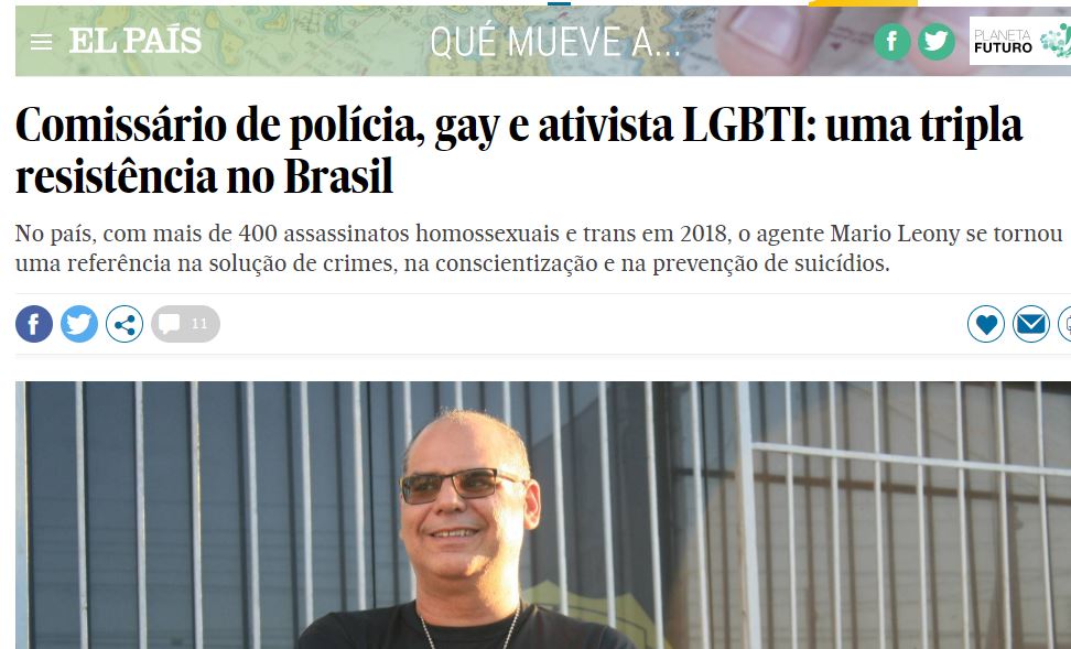 Delegado e LGBT, militante do PSOL sergipano é destaque na imprensa espanhola O delegado da Polícia Civil do Estado de Sergipe, Mario de Carvalho Leony, foi destaque no periódico espanhol El Pais na edição da terça-feira (5). A entrevista assinada pelo jornalista Adriano José dos Santos, sergipano radicado em Valência, conta a vida, a trajetória e a militância política de Mário._“No país com mais de 400 assassinatos homossexuais e trans em 2018, o agente Mario Leony se tornou uma referência na solução de crimes, na conscientização e na prevenção de suicídios”,_ assinala a entrevista. Mário Leony é membro da Rede Nacional de Operadores da Segurança Pública LGBT (Renosp), da organização nacional “Policiais Antifascismo”, é filiado ao Partido Socialismo e Liberdade (PSOL) desde 2014 e foi candidato a deputado federal no pleito de 2018. Toda matéria aqui.