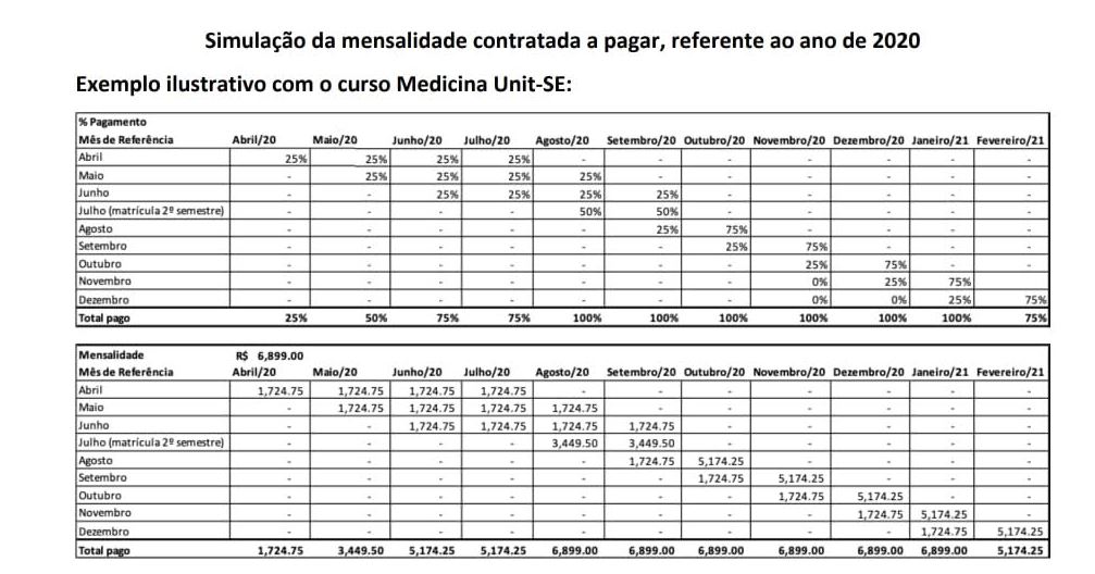 “Essa tabela apenas adia o pagamento das mensalidades, ou seja, os estudantes continuam pagando o valor integral das mensalidades. Não é justo pagar um valor integral sem a integralidade da prestação do serviço. Estamos em uma situação excepcional que enseja revisão e gritante falha na prestação do serviço! Os colégios as faculdades estão alegando que não podem reduzir as mensalidade, uma vez que, continuam pagando os seus professores e empregados. Só que no curso de medicina esses valores representam um percentual pequeno em relação aos outros itens, uma vez que a hora aula dos professores é quase a mesma dos demais cursos em razão dos sindicatos. Acontece que o curso de medicina é sete vezes mais caros do que os outros. Por isso é necessário que a UNIT, por uma questão de clareza informe qual os valores que integram as mensalidades. Em síntese. Como eles chegaram que o valor seria 7.000,00. Se faz necessário a UNIT detalhar os gastos com o curso de Medicina que forma contratados de forma presencial e não EAD. Os pais de alunos de Medicina da UNIT irão solicitar todas essas informações, bem como, uma composição extrajudicial e caso lhes sejam negados todos os direitos ingressarão em massa na Justiça.”