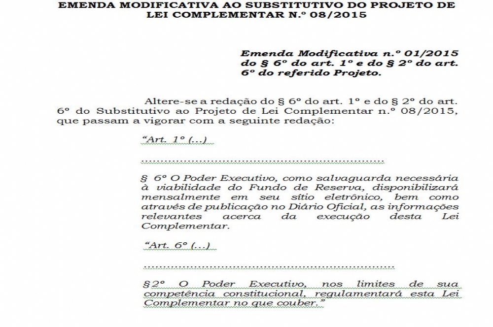 Emenda do governador em decorrência de manifestação do Tribunal de Justiça. A emenda aprovada alterou a redação do § 6º do art. 1º e do § 2º do art. 6º do Substitutivo ao Projeto de Lei Complementar n.º 08/2015, conforme quadro ao lado.