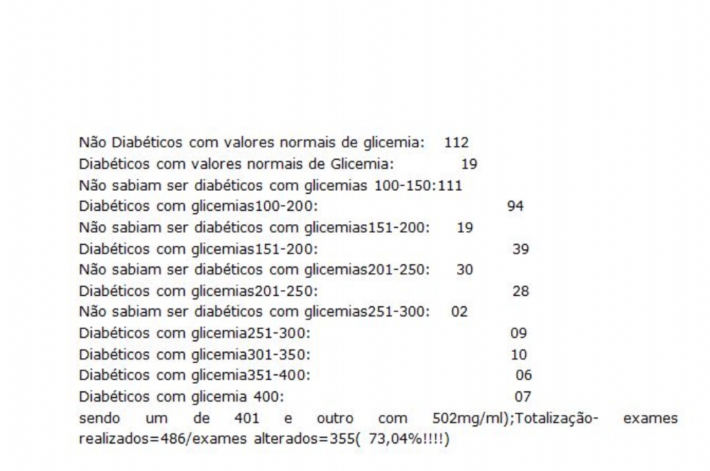 dos estudantes de Enfermagem das duas Universidades ( UFS e Tiradentes ),que fizeram a aferição da Pressão Arterial,e dos estudantes de Fisioterapia que fizeram uma cuidadosa avaliação do pé do diabético, até então desconhecida da grande maioria do publico presente.Foram utilizados na detecção monitores accu-chek do laboratório Roche,a grande importância desse trabalho é que os indivíduos que apresentaram exames alterados na dosagem de sangue capilar foram encaminhados para unidades de Saúde da Secretaria Municipal de Lagarto,ou para os Serviços de Diabetes da Cidade de Aracaju,ou então para o Centro de Especialidades Médicas de Aracaju ( CEMAR ),na finalização do Mutirão foram encontrados os resultados da tabela ao lado.