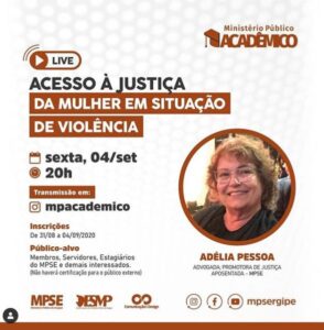 Live hoje, 04/09, às 20h “Acesso à Justiça da Mulher em Situação de Violência” A edição do Programa “Ministério Público Acadêmico”, iniciativa da Procuradoria-Geral de Justiça, por meio da Coordenadoria de Ensino da Escola Superior do Ministério Público (ESMP) – terá como convidada a promotora de Justiça aposentada do MPSE e advogada Adélia Pessoa. A Live será realizada hoje, 04, a partir das 20h, e discutirá sobre “Acesso à Justiça da Mulher em Situação de Violência”. Não haverá certificação para o público externo, portanto não é necessário fazer inscrição. Transmissão no Instagram: https://www.instagram.com/mpacademico/