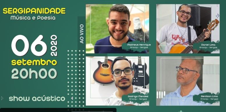 Sergipanidade 06/09 às 20h. No programa Sergipanidade deste domingo muita música e poesia com Matheus Henrique, Daniel Lima/SE, Rodrigo Mendes/SE e Renilson Lima/SE.Quem vai perder essa? No canal do youtube Artes FEES: