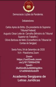 Democracia: Lições da Pandemia, nesta sexta-feira, 04/09, às 16h A Academia Sergipana de Letras Jurídicas realiza nesta sexta-feira, 04, às 16h, um debate sobre “Democracia: Lições da Pandemia” com a participação do ex-presidente do Supremo Tribunal Federal – STF, Carlos Ayres de Britto, do Ministro do Tribunal Superior do Trabalho – TST, Augusto César Leite de Carvalho e do conselheiro do Tribunal de Contas de Sergipe –TCE/SE, Clóvis Barbosa de Melo. Pela plataforma zoom: