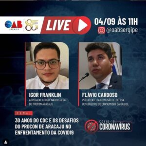 Live hoje, 04/09, às 11h, 30 anos do CDC e os desafios do Procon de Aracaju no enfrentamento da Covid-19 E nesta sexta-feira, dia 04, estão todos convidados para mais uma #oabselive às 11h, e com o tema: 30 anos do CDC e os desafios do Procon de Aracaju no enfrentamento da Covid-19. O Presidente da Comissão de Defesa dos Direitos do Consumidor da nossa Seccional, Flávio Cardoso conversa com Igor Franklin, Coordenador Geral do Procon Aracaju. Participe: