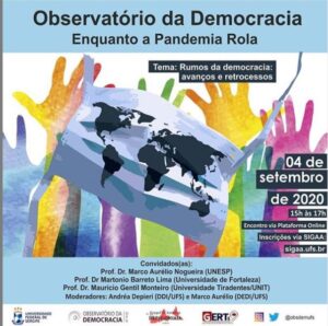 Live hoje, 04/09, das 15 às 17h “Rumos da Democracia: Avanços e Retrocessos” Na sexta, dia 4 de setembro, das 15h às 17h, o Observatório da Democracia da UFS realiza mais uma edição do evento online Enquanto a Pandemia Rola, com o tema “Rumos da Democracia: Avanços e Retrocessos”. A mesa contará com a participação dos professores Dr. Marco Aurélio Nogueira (UNESP), Dr. Martonio Barreto Lima (Unifor) e Dr. Maurício Gentil Monteiro (Unit), com mediação dos professores Dra. Andréa Depieri (DDI/UFS) e Dr. Marco Aurélio Dias (DEDI/UFS). As inscrições podem ser realizadas via Sigaa/UFS.