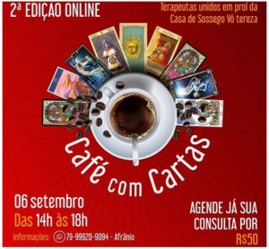 Tereza Diversos tarólogos vão se reunir para mais uma edição do Café com Cartas. O evento será on-line e acontecerá no dia 6 de setembro, das 14h às 18h. No evento, os participantes poderão participar de consultas on-line de cartas/Tarô. A inscrição custa R$ 50 e dá direito a uma consulta de 30 minutos. Todo o valor arrecadado será doado a Casa de Sossego Vó Tereza. Inscrições podem ser feitas por meio do telefone (79) 99920-9094. Conheça mais sobre a Casa de Sossego Vó Tereza: https://www.casadesossegovotereza.com.br/