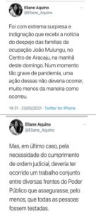 “Foi com extrema surpresa e indignação que recebi a notícia do despejo das famílias da ocupação João Mulungu, no Centro de Aracaju, na manhã deste domingo. Num momento tão grave de pandemia, uma ação dessas não deveria ocorrer, muito menos da maneira como ocorreu.