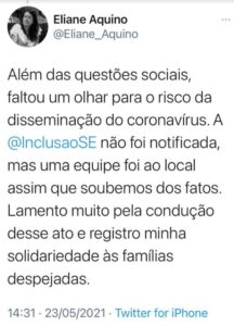 Além das questões sociais, faltou um olhar para o risco da disseminação do coronavírus. A @InclusaoSE não foi notificada, mas uma equipe foi ao local assim que soubemos dos fatos. Lamento muito pela condução desse ato e registro minha solidariedade às famílias despejadas.”