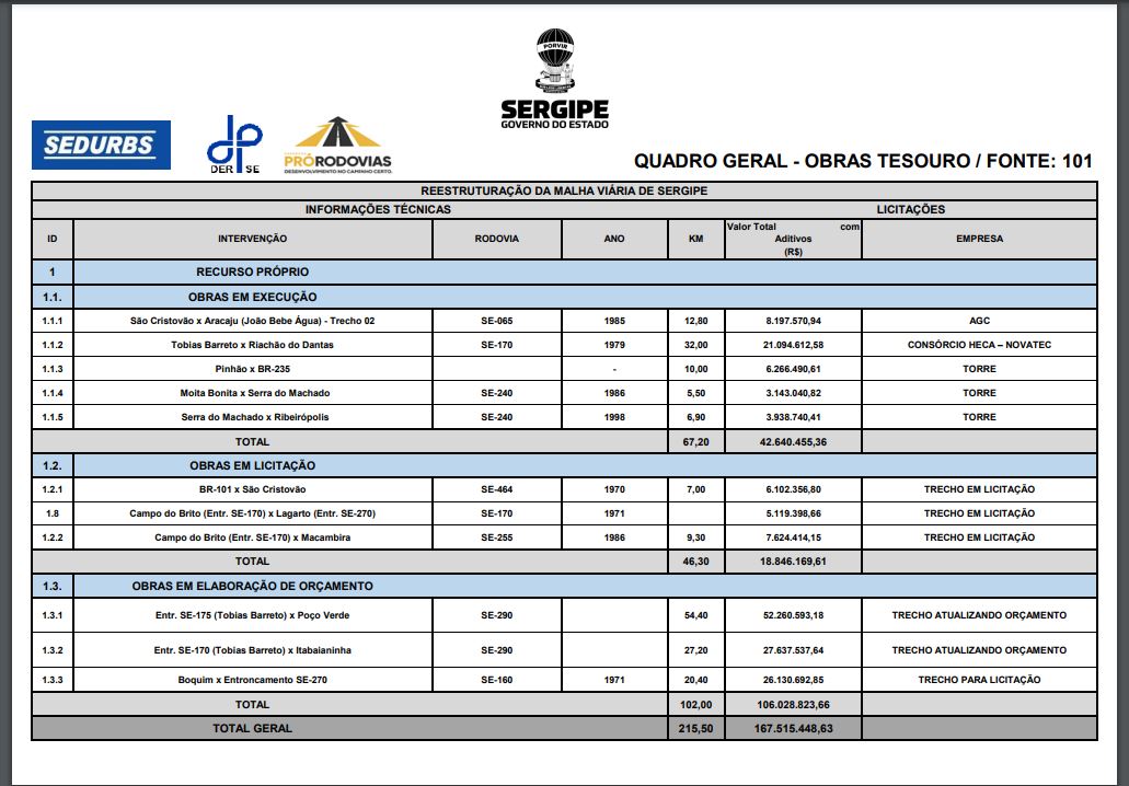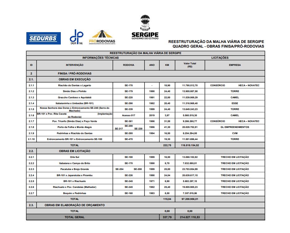 Rodovias estaduais: Sedurbs enviou planilha com obras em execução e em processo de licitação Em resposta à nota ‘Cadê os R$ 200 milhões assinados com a Caixa em setembro de 2020?’, publicada em vossa coluna no dia 24 de maio de 2021, a Secretaria de Estado do Desenvolvimento Urbano e Sustentabilidade – Sedurbs encaminha uma planilha com as obras em execução e em processo de licitação do contrato assinado com o Financiamento à Infraestrutura e ao Saneamento voltado ao Setor Público (Finisa), bem como, das obras em execução e em processo de licitação, oriundas de recursos do Tesouro Estadual. Abaixo a planilha: