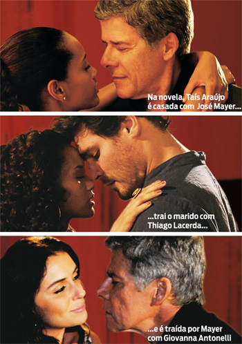 egoísta – na verdade, os três vivem um perverso jogo de sentimentos ambíguos e projetados, característicos da traição. Fica claro, por exemplo, que os “pombinhos-corvinhos” estão somente à espera do falecimento da enferma para dividir a cama. A dela. Entre outros personagens, essa espera inexiste: o protagonista Marcos (José Mayer) está traindo Helena (Taís Araújo) com a própria amiga dela, Dora (Giovanna Antonelli), que é hóspede na casa dos dois. Dora, por sua vez, engana o namorado, Maradona – tanto que está grávida e não sabe quem é o pai. A ode à traição e confusão não para aí: Helena também trai o marido com o personagem Bruno (Thiago Lacerda). Mais uma vez, deu? Tem mais: o advogado Gustavo (Marcello Airoldi) passa para trás a sua mulher, Betina (Letícia Spiller), saindo com a prima dela, a jornalista Malu (Camila Morgado). Esses casos, somados a outros tantos de infidelidade, talvez deixassem envergonhados os dramaturgos William Shakespeare de “Hamlet” e Nelson Rodrigues de “Perdoa-me por me traíres”.