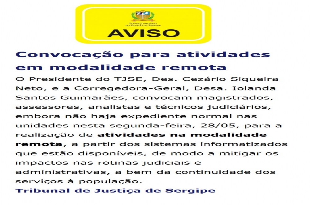 | Em nota TJSE realizará atividades em modalidade remota. O expediente está suspenso. |