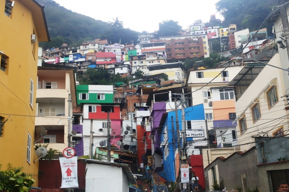 Casas multicores – No Morro Dona Marta, ou comunidade Santa Marta, os visitantes têm ao seu favor uma das mais privilegiadas vistas do Pão de Açúcar e das praias do Rio de Janeiro. A própria favela, sua história, sua gente, sua cultura, são atrativos que se confundem com a história da expansão do Rio de Janeiro.