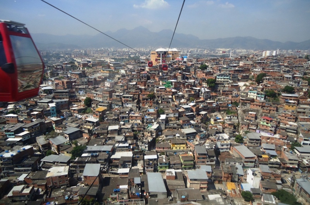 Partindo da estação da comunidade da Fazendinha, em Inhaúma, zona norte do Rio, percorre todo o complexo observado de cima, numa vista encantadora do traçado da comunidade, com suas lajes com piscinas de plástico, antenas parabólicas e desníveis das construções.