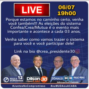 Live hoje, 06/07, às 19h Porque estamos no caminho certo CREA/SE Convite Dilson Luiz: “O nosso canal aberto para você continua. Nossa LIVE vai tratar de assuntos importantes, desta vez com horário limitado e com mediação. Plano de gestão, dirimir dúvidas, responder a questionamentos e fazer um panorama da eleição será o nosso foco. Tudo para você. O link está na bio do Instagram da campanha: https://www.instagram.com/crea_presidente30/