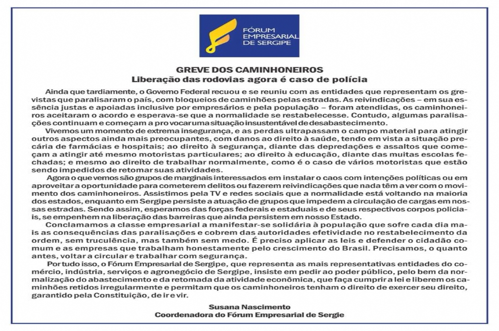 Nota Fórum Empresarial de Sergipe Em nota Fórum Empresarial de Sergipe pede pede providências ao governo, pelo bem da normalização do abastecimento e da retomada da atividade econômica, que faça cumprir a lei e libere os caminhões retidos irregularmente e permitam que os caminhoneiros tenham o direito de exercer seu direito, garantido pela Constituição de ir e vir. Leia print da nota.
