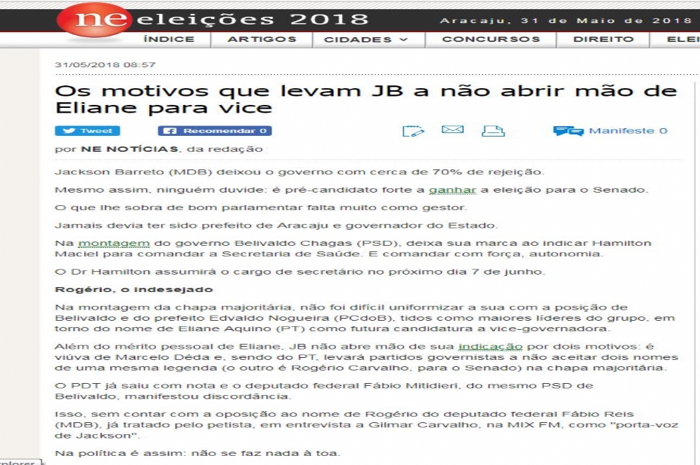 atitudes fortes do candidato Belivaldo Chagas. Rogério e todo o PT, não aceitarão que Edvaldo Nogueira, apoiado por eles em 2016, apoie Belivaldo e Jackson e a segunda opção para o Senado seja “liberada” claramente para André Moura na justificativa que ele ajuda Aracaju.