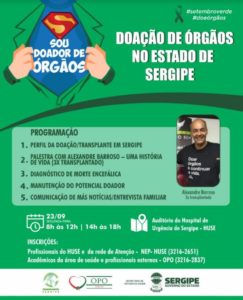 da Saúde (SES), através da Central de Transplantes (CET) e da Organização de Procura de Órgãos (OPO) do Estado, vai realizar no próximo dia 23 de setembro, das 08h às 12h e das 14h às 18h, no Auditório do Hospital de Urgência de Sergipe (Huse), um evento em homenagem ao Setembro Verde (em alusão ao Dia Nacional da Doação de Órgãos e Tecidos). Com o tema “Doação de Órgãos no Estado de Sergipe”, o evento abordará diversas palestras voltadas para profissionais do Huse e da Rede de Atenção, acadêmicos da área de saúde, além de profissionais externos. Como participar Para participar do evento, os profissionais do Huse e da Rede de Atenção devem procurar o Núcleo de Educação Permanente (NEP) do hospital ou em caso de dúvidas ligar para o telefone do setor (3216-2651). Para os participantes acadêmicos da área de saúde ou profissionais externos, a inscrição deve ser realizada na OPO do Huse e em caso de dúvidas pelo telefone do setor (3216-2837).