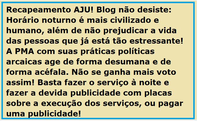 Recapeamento na Avenida Beira Mar à noite O blog parabeniza a Associação dos Militares do Estado de Sergipe, AMESE, por ingressar com uma ação judicial para que a Prefeitura de Aracaju faça o recapeamento no horário noturno. Os transtornos são muitos. Edvaldo criou um caos e não está preocupado porque em 2020 o povo esquecerá de tudo. A AMASE pediu na Justiça que o recapeamento seja realizado no horário entre às 19h e 5h.