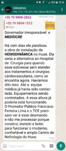 Sobre a matéria do JN com a paralisação das cirurgias cardíacas no Hospital de Cirurgia, o ex-secretário Almeida Lima postou no grupo de WhatsApp “Universo Político”: “Governador irresponsável e medíocre. Há cem dias ele paralisou a obra da Hemodinâmica no HUSE. Ela seria a alternativa ao Hospital de Cirurgia para quando esse estivesse sem atender aos tratamentos e cirurgias cardiovasculares, como se encontra agora. Havíamos dito isso. Até a equipe médica já havia sido contactada. Equipamentos sendo contratados. A essa altura já poderia está funcionando. O Promotor Público Francisco Ferreira Lima e o TCE precisam ver é esse desmando e não me processar porque construí, instalei e botei para funcionar o moderno, confortável e amplo Centro de Nefrologia do HUSE.”