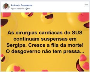www.twitter.com/AntonioSamarone As cirurgias cardíacas do SUS continuam suspensas em Sergipe. Cresce a fila da morte! O desgoverno não tem pressa…