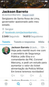 se reuniu com o secretário de segurança e com o comandante da PMSE, e pediu um estudo para aumentar o valor do ticket alimentação da polícia militar. O governo Belivaldo Chagas, que pertence ao mesmo grupo político e até agora não concluiu o tal “estudo”, ficando tudo no campo da promessa. Não sabermos o motivo de não ter sido estudado o aumento do ticket alimentação para os bombeiros militares também.