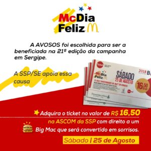 McDia Feliz, coordenada pelo Instituto Ronald McDonald desde 2001, e que em Sergipe beneficiará a Associação dos Voluntários a Serviço da Oncologia em Sergipe (Avosos). O evento social acontecerá dia 25 de agosto em todas as lojas do McDonalds, que objetiva direcionar a renda líquida adquirida com os sanduíches Big Mac para instituições de combate ao câncer infanto-juvenil.