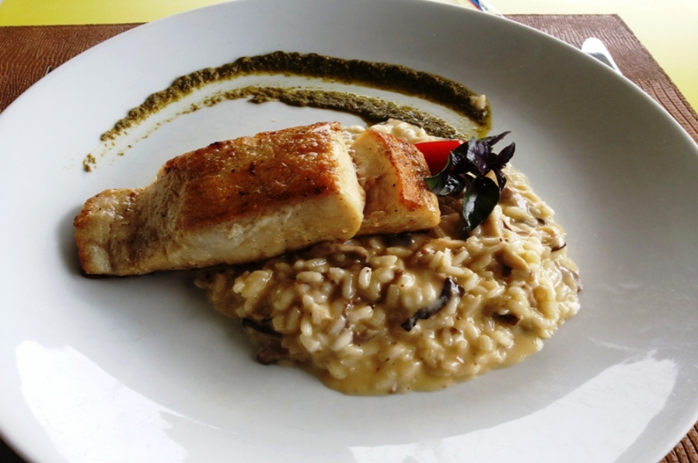 | Atum selado com camarãocrocante e purê aromatizado com raiz forte e nirá |