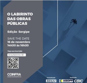 O Labirinto das Obras Públicas. Edição Sergipe No dia 16/11, às 14h30, a Comissão de Infraestrutura (Coinfra) da Câmara Brasileira da Indústria da Construção (CBIC) realizará mais uma edição do evento que tem como objetivo visitar todos os estados do Brasil para entender os entraves locais e buscar soluções para superá-los. O evento tem interface com o projeto “Melhoria da competitividade e da Segurança Jurídica para Ampliação de Mercado na Infraestrutura” da Comissão de Infraestrutura (Coinfra) da CBIC, com correalização do Serviço Nacional de Aprendizagem Industrial (Senai Nacional).