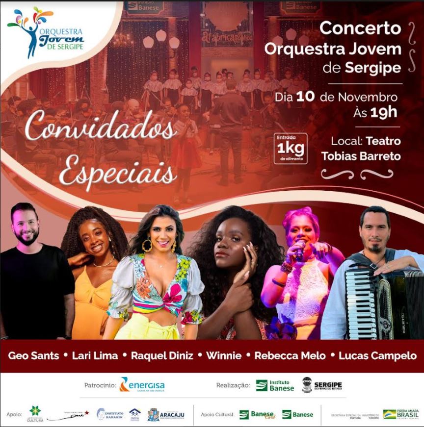 Jovens dos bairros Santa Maria e 17 de Março Com participações de artistas sergipanos, a apresentação será beneficente, cuja entrada será possível com a doação de 1kg (um quilo) alimento não perecível, exceto sal. Todos os alimentos arrecadados serão entregues às famílias dos alunos do projeto, moradores dos bairros Santa Maria e 17 de Março. Winnie, Geo Sants, Lucas Campelo, Raquel Diniz, Lari Lima e Rebecca Melo, são os convidados para esta noite especial.