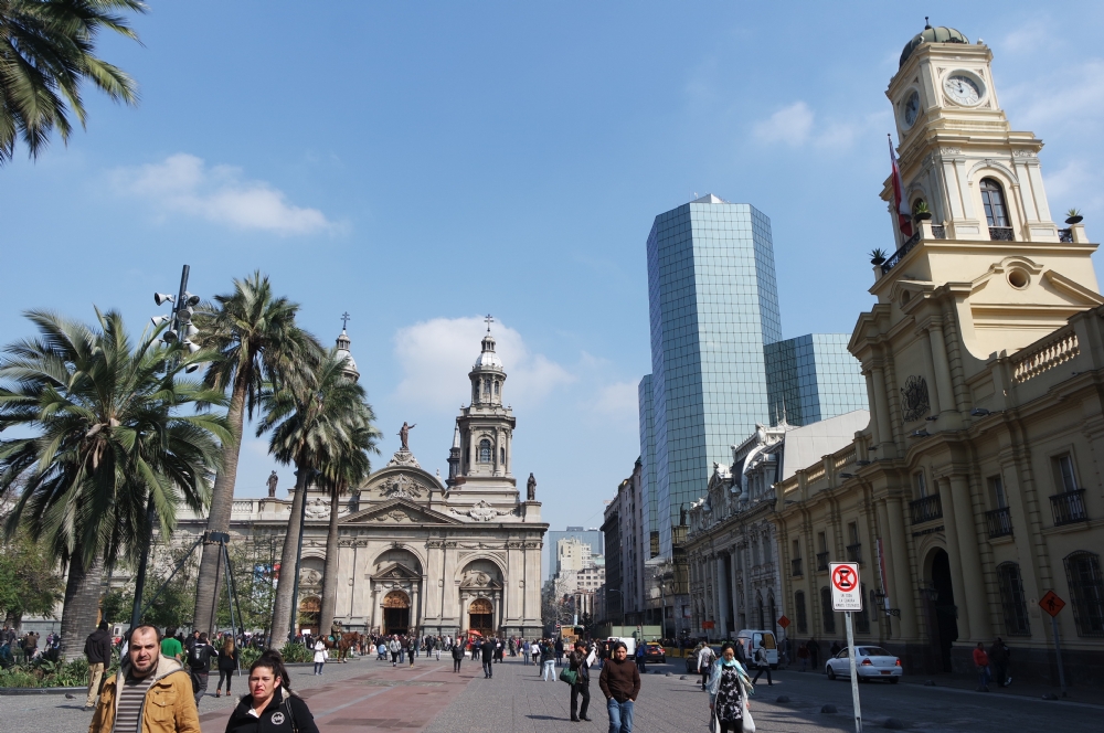 Percorrendo até mais adiante, chega-se a Plaza de Armas ou Praça Maior, com o imponente Congresso Nacional, o Museu de Arte Pré-Colombiana, a Catedral Metropolitana, o Palácio da Justiça e Correio Central, o Quartel dos Bombeiros, o Museu Histórico Nacional e a Municipalidade de Santiago.