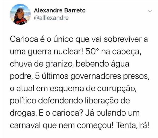 www.twitter.com/alllexandre Carioca é o único que vai sobreviver a uma guerra nuclear! 50° na cabeça, chuva de granizo, bebendo água podre, 5 últimos governadores presos, o atual em esquema de corrupção, político defendendo liberação de drogas. E o carioca? Já pulando um carnaval que nem começou! Tenta,Irã!