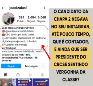 Vergonha? Amanhã, 23, e quarta-feira, 24, acontecem as eleições para o Conselho Regional de Contabilidade de Sergipe (CRC). Duas chapas estão na disputa. A chapa 1 encabeçada por Salete Barreto e a 2, que tem à frente o advogado e corretor de imóveis, João Izaias. Por incrível que pareça, até o início da campanha, o candidato fazia questão de expor em sua bio no Instagram que era advogado e corretor de imóveis. E justamente a de “contador” não constava na descrição. Por que a omissão? Seria vergonha? E justamente agora ele se apresenta como uma opção para a presidência do Conselho. Em tempos de redes digitais e prints instantâneos não se pode cometer uma gafe dessa. Nossa solidariedade aos contadores de Sergipe.