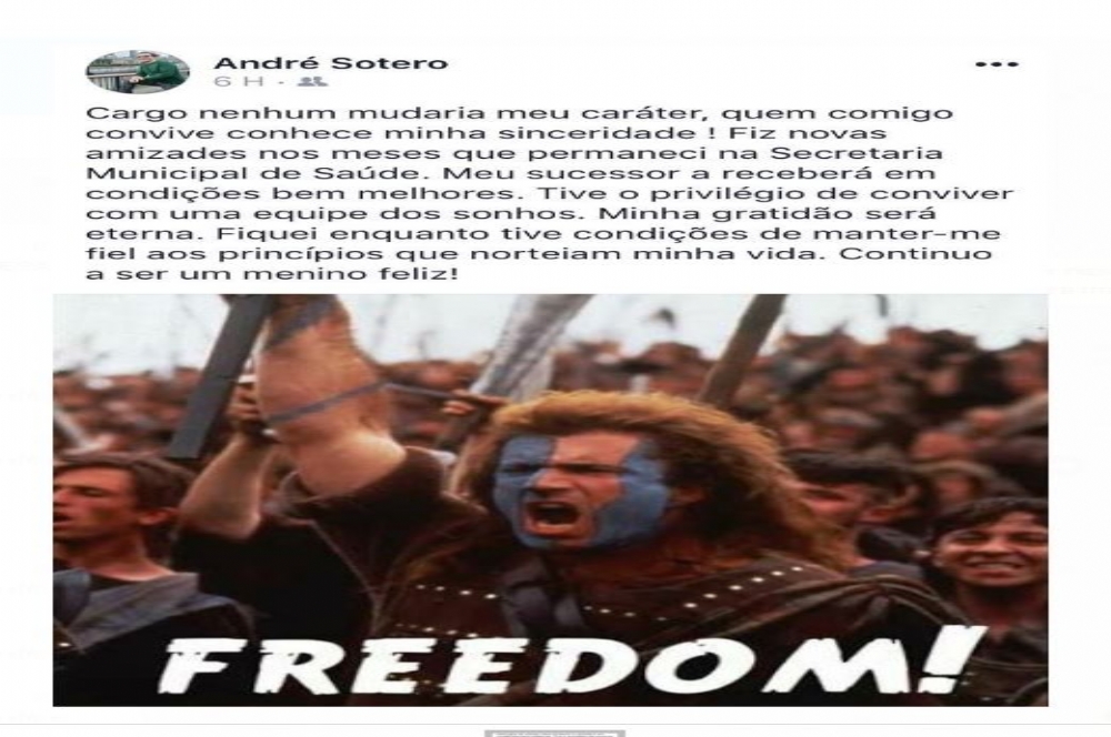 | A publicação de André numa rede social, com a foto de Mel Gilbson, interpretando o herói escocês Willian Wallace, no filme Coração Valente. Abaixo a inscrições Freedom ((Liberdade). |