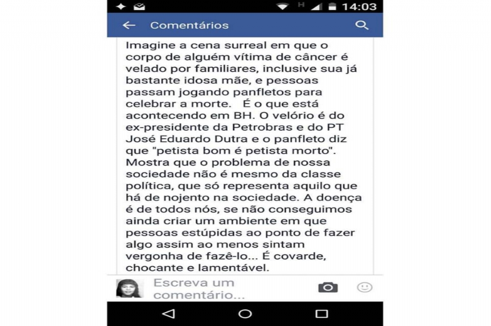 infelizmente, mais uma vez, nesse domingo, vimos – e estamos vendo – puras manifestações de ódio e desumanidade, no caso, contra a pessoa de Zé Eduardo, após sua morte. O festival de ódio e irracionalidade, lamentavelmente, era algo esperado por qualquer pessoa atenta à escalada medieval-fascista que ocorre nesses dias. Vejam aqui, nos comentários, algumas dessas manifestações.