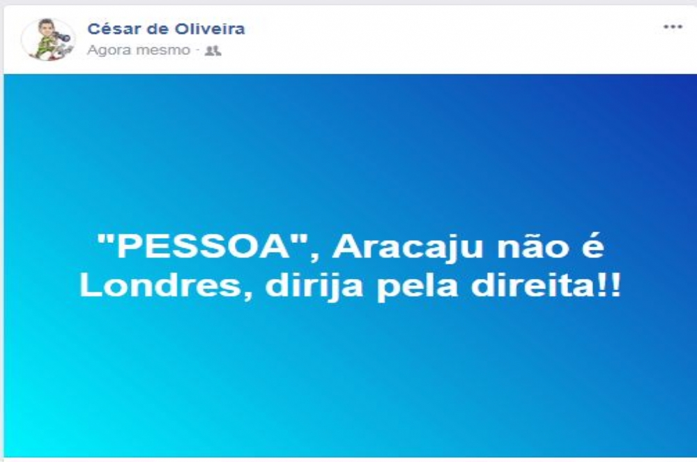 (aguardem fotos nos próximos dias) tem motorista em Aracaju que parece que tirou a CNH e não aprendeu as regras básicas. Uma delas, quem está dirigindo “quase parando” tem que ficar na faixa direita, para deixar o trânsito fluir. É simples assim, mas em Aracaju é mais fácil transitar rapidamente pela direita, porque na esquerda tem sempre “uma pessoa”, como escreveu o fotojornalista César de Oliveira no Facebook, achando que está em Londres. Tem mão inglesa aqui não “pessoa” tem sim mãe de motorista sendo xingada e muito…
