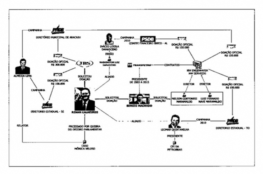 Organograma da corrupção Do site O Antagonista: Na denúncia contra Renan Calheiros, Rodrigo Janot estampa num organograma as relações que exemplificariam o repasse de propina, solicitada por Sérgio Machado, ao empresário Luiz Ramaldo, em contrapartida a contratos na Transpetro.