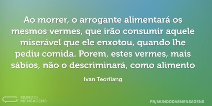 “Ao morrer, o arrogante alimentará os mesmos vermes, que irão consumir aquele miserável que ele enxotou, quando lhe pediu comida. Porem, estes vermes, mais sábios, não o descriminará, como alimento.” Ivan Teorilang.