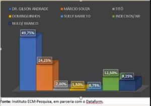 ECM-Pesquisas, em parceria com a equipe do Dataform, apontou que se a eleição fosse hoje, o candidato à reeleição Gilson Andrade, prefeito de Estância estaria eleito em todos os cenários. A pesquisa foi realizada com 400 eleitores entre os dias 28 e 29 de outubro e registrada com o número SE – 00361/2020. Na espontânea, Gilson Andrade tem 49,75%; Márcio Souza, 24,25%; Titó, 2%; Dominguinhos, 1,5% e Suely Barreto, 0,75%. Os indecisos e não responderam 12,50% e nulo 9,25%. Na induzida Gilson Andrade dispara para 50%, ficando em segundo lugar, Márcio Souza com 24,75%.
