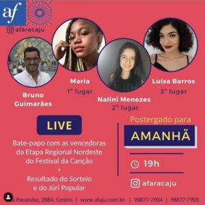Live hoje, 10/11, às 19h Bate-papo com as vencedoras da Etapa Regional Nordeste do Festival da Canção +