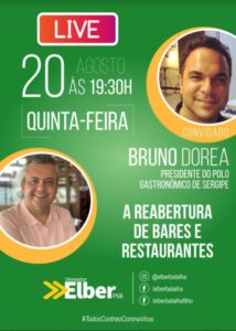 Live hoje, 20/08, às 19h30 “A reabertura dos bares e restaurantes” Este é o tema da live de hoje, 20, às 19h30, mediada pelo vereador Elber Batalha Filho tendo como convidado o presidente do polo gastronômico de Sergipe, Bruno Dorea. Acompanhe aqui: https://www.instagram.com/elberbatalha/