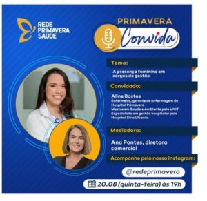 Live hoje, 20/08, às 19h, Primavera Convida “A presença feminina em cargos de gestão” No projeto “Primavera Convida” de hoje, 20, a presença da enfermeira Aline Bastos para debater o tema “A presença feminina em cargos de gestão”, tendo como mediadora Ana Ponte, diretora comercial da Rede. Acompanhe: https://www.instagram.com/redeprimavera/