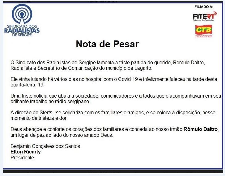 internado por conta da Covid-19. Rômulo fazia parte da nova safra de radialistas que atua no interior de Sergipe e tinha assumido a pasta da comunicação da Prefeitura de Lagarto em março deste ano. A solidariedade do blog à toda família.