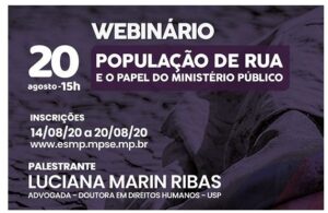do Ministério Público” para membros, servidores e demais interessados, por meio do canal do YouTube do MPSE. O Webinário terá como palestrante a advogada, consultora jurídica e doutora em Direitos Humanos pela Universidade de São Paulo (USP), Luciana Marin Ribas. Ela também é mestra em Direito Constitucional pela Pontifícia Universidade Católica de São Paulo (PUC-SP) e, atualmente, trabalha na coordenação acadêmica da pós-graduação lato sensu em Direito da Fundação Getúlio Vargas, em São Paulo. Para acompanhar o webinário no canal do YouTube do MPSE: https://www.youtube.com/watch?v=IDlE_KuKscM A certificação será disponibilizada apenas para membros e servidores do MPSE, condicionada à realização de inscrição prévia no Sistema de Gestão de Eventos da ESMP/SE (SGE) e preenchimento, no dia do evento, de formulário eletrônico de registro de presença, no início e fim do Webinário. O 19 de agosto é marcado como o Dia Nacional de Luta da População em Situação de Rua. A data é alusiva à memória das pessoas mortas no “Massacre da Sé”, que aconteceu entre os dias 19 e 22 de agosto de 2004, em São Paulo. Nessa data, talvez um dos dias mais violentos na vida da população em situação de rua, 15 pessoas que utilizavam o espaço da Praça da Sé como moradia improvisada foram brutalmente atacadas durante a noite, resultando em sete mortos e oito feridos gravemente.