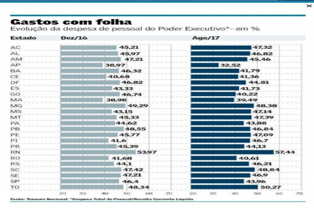 Segundo a matéria dos 25 Estados, 16 ultrapassaram algum limite estabelecido pela Lei de Responsabilidade Fiscal (LRF). Quatro Estados estão acima do limite de alerta correspondente à despesa de pessoal de 44,1% da receita corrente líquida. Outros dez romperam o limite prudencial, de 46,55%, e dois estouraram o teto de gastos permitido pela legislação fiscal, de 49%.