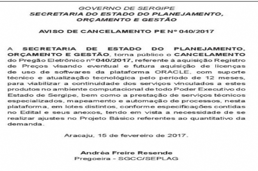 Para não deixar duvidas no ar pregão eletrônico 040/2017, para aquisição de Licenças de Uso de Software e Serviços foi cancelado. Jackson e